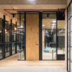 Glazed partitioning wall with Viennese glazing bars made from aluminium profiles, single-glazed.